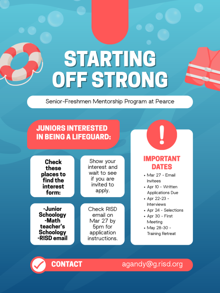 Juniors and Junior Parents, the process for becoming an SOS Lifeguard has begun. All juniors need to do right now is express interest in the Google Form they were provided. This can be found in several places – on the Junior Schoology, on their Math Teacher’s Schoology, and in their RISD email inbox. This form needs to be filled out by the Wednesday after Spring Break, Mar 25. Juniors will find out in an email by 5pm on Fri, Mar 27 if they are invited to apply. That email will explain the rest of the process. SOS is not looking for one type of student. They want people who are driven to connect with others and to share all they have learned as Mustangs with our newest class to help them be successful! Email agandy@g.risd.org with any questions.