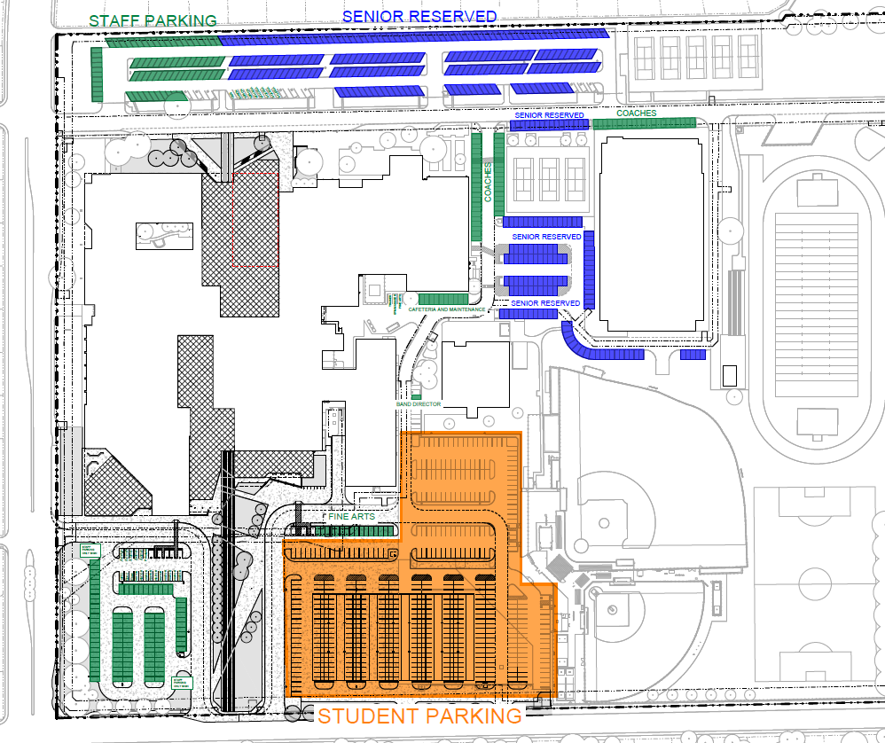 - Green Areas (Staff, Coaches, Fine Arts): Not available for student parking.