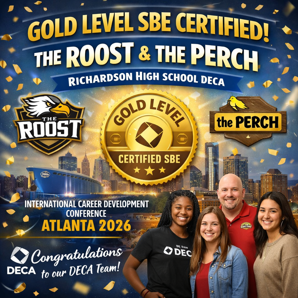 Richardson High School’s DECA chapter is proud to announce that both the ROOST and the PERCH have once again earned Gold-Level School-Based Enterprise (SBE) Certification from DECA Inc. for the 2025–2026 school year.