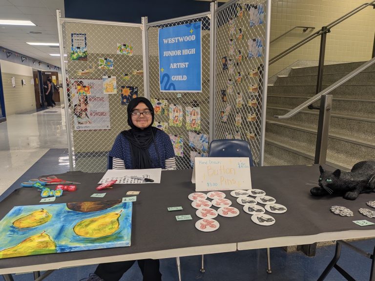 The WWJH Art Guild just had another successful art sale to raise funds for art supplies, field trips, and activities for the guild members. They set up their store at the Band Concert this week. They made over $100 at the sale selling paintings, buttons, pins, prints, live caricature drawings, and face painting! We also recently elected officers, President :Cassiopeia, Event Coordinator: Eleanor, Treasurer: Savannah